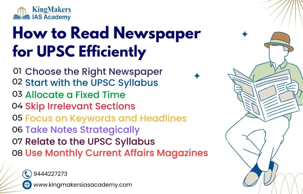To conclude, knowing how to read newspaper for UPSC is not just about reading every word – it is about reading strategically, focusing on relevant topics, and making effective notes. By incorporating these strategies into your daily routine and joining the best UPSC coaching centre like the KingMakers IAS Academy, you will not only improve your current affairs knowledge but also develop the analytical thinking required for the UPSC exam.